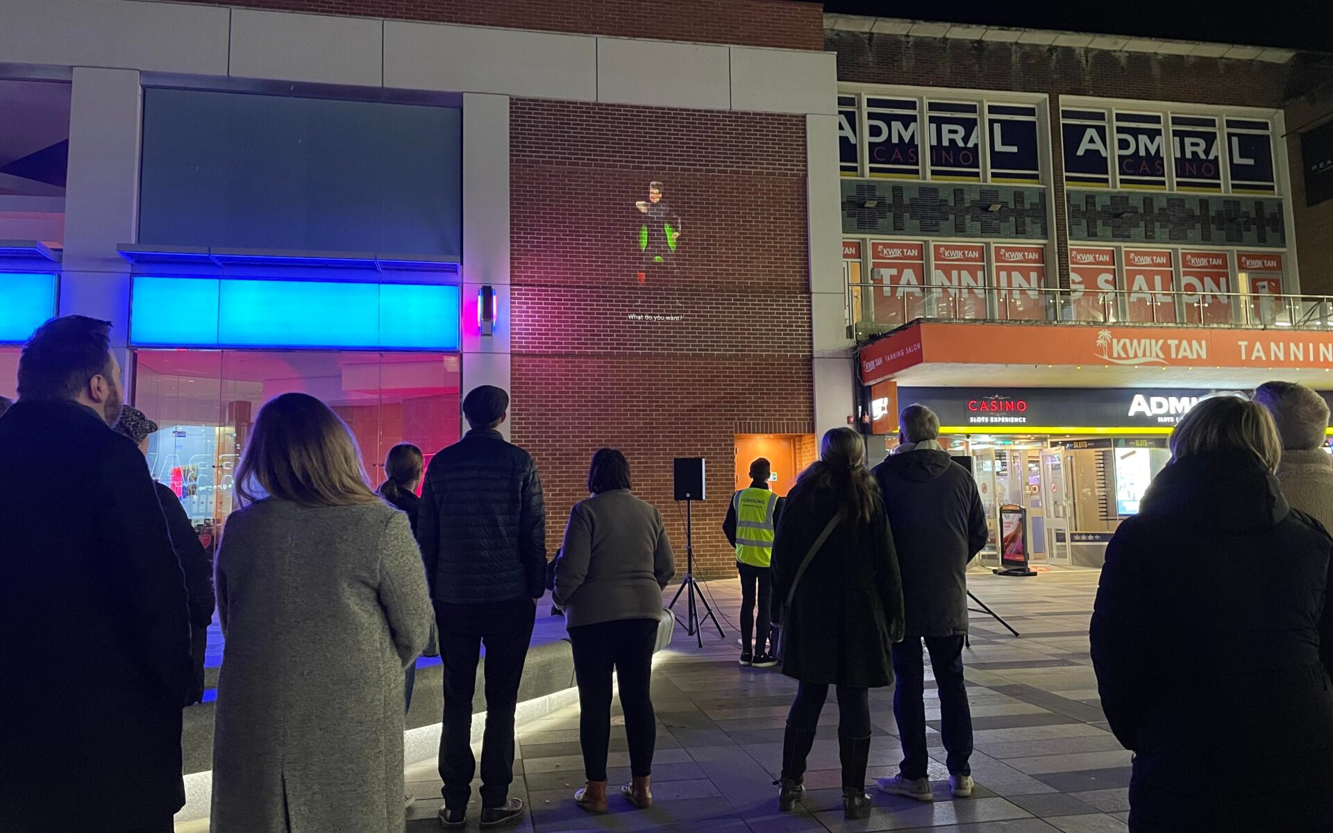 Audiences gathered to watch short films projected onto the streets of Crawley as part of videoclub’s Night Watch film trail. Five films by British and international artists were shown above shops and on buildings.