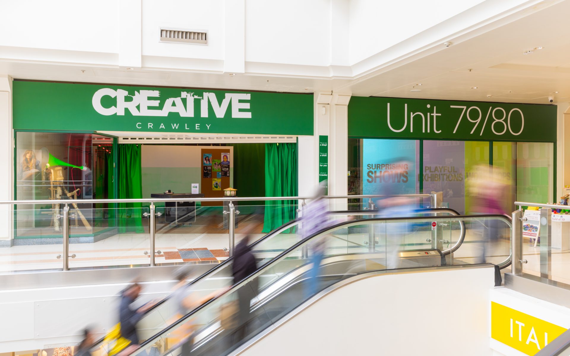 From the beginning of April to the end of June 2025, Unit 79/80 County Mall became a temporary performance and exhibition space thanks to a partnership between Creative Crawley and AudioActive funded by Arts Council England and supported by Pop Up Culture Crawley & Crawley Borough Council via the Towns Fund.